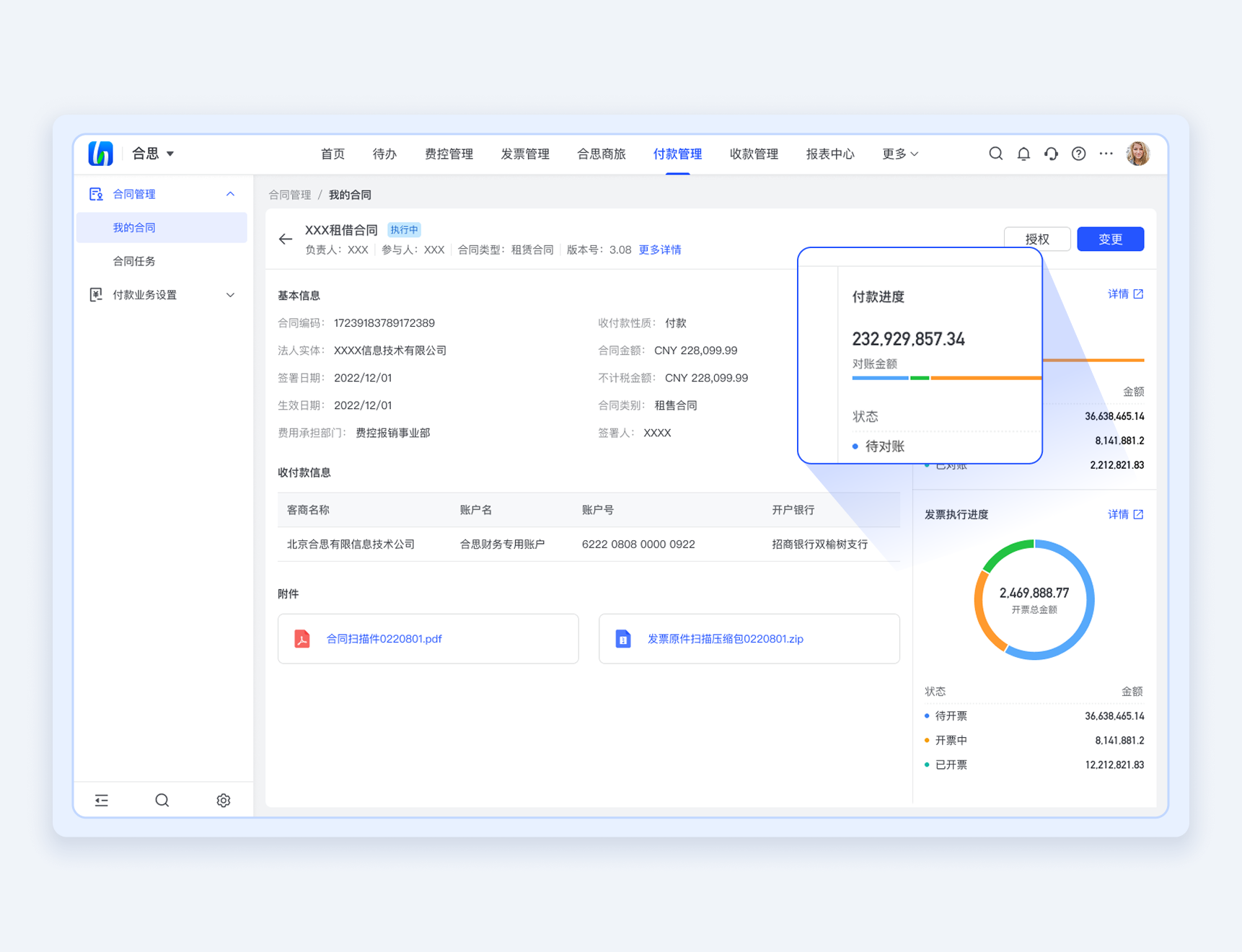 支持合同信息关联的付款进度及详情、发票进度查看,便于跨部门合同信息共享。发起结算时,可关联该合同,穿透联查。